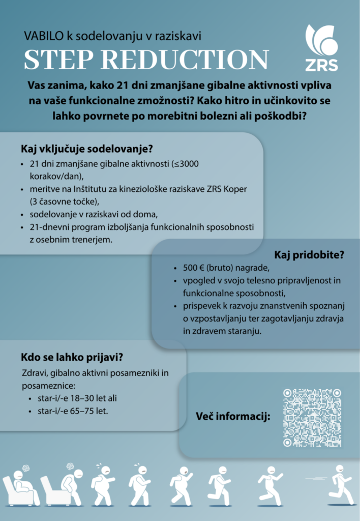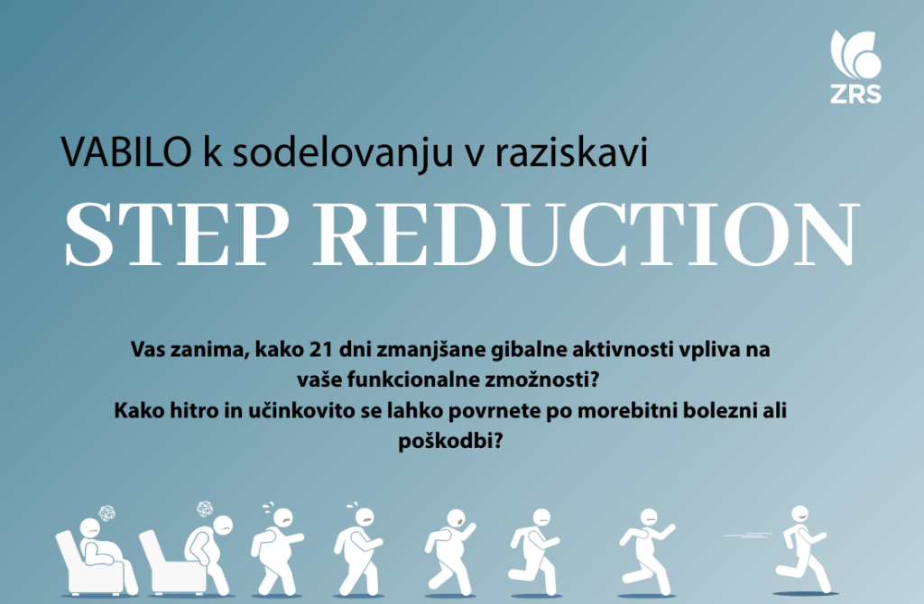 Znanstveno-raziskovalno središče (ZRS) Koper išče prostovoljce in prostovoljke za sodelovanje v raziskavi Step Reduction, v kateri bodo preučevali, kako 21-dnevno zmanjšanje števila dnevnih korakov vpliva na zdravje in telesno pripravljenost ter kako nato telo povrniti nazaj v prvotno stanje.