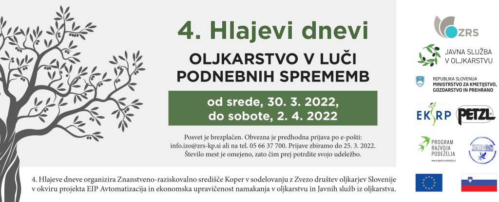 4. Hlajeve dneve organizira Znanstveno-raziskovalno središče Koper v sodelovanju z Zvezo društev oljkarjev Slovenije v okviru projekta EIP Avtomatizacija in ekonomska upravičenost namakanja v oljkarstvu in Javnih služb iz oljkarstva.