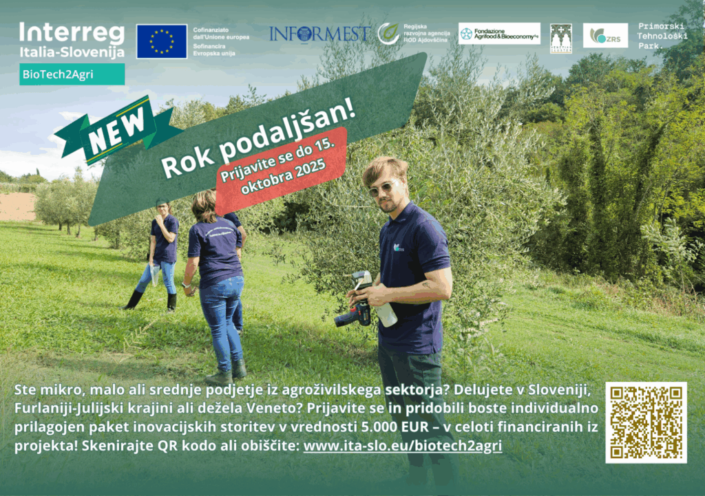 V okviru projekta BioTech2Agri (Interreg VI-A Italija-Slovenija 2021-2027 ITA-SI0600180) je objavljen javni razpis za mala in srednja podjetja iz agroživilskega sektorja za podporo pri raziskovanju in uvajanju inovativnih biotehnoloških rešitev.