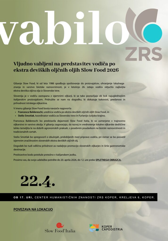 Inštitut za oljkarstvo ZRS Koper v sodelovanju in ob podpori Zavoda za mladino, kulturo in turizem Koper (ZMKT) vabi na predstavitev vodiča po ekstra deviških oljčnih oljih Slow Food 2026, ki bo v sredo, 22. aprila, ob 17. uri, v Centru humanističnih znanosti ZRS Koper, na Kreljevi 6, v Kopru.