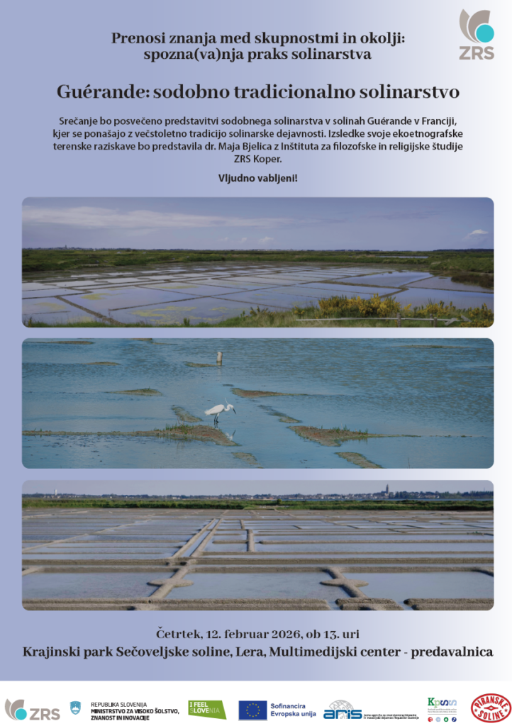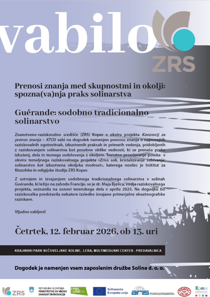 Znanstveno-raziskovalno središče (ZRS) Koper je v okviru projektov Konzorcij za prenos znanja – KTO3 in temeljnega raziskovalnega projekta »Zrno soli, kristaliziranje sobivanja: solinarstvo kot izkustvena okoljska modrost« organiziralo že drugi dogodek, tokrat z naslovom: Prenosi znanja med skupnostmi in okolji: spozna(va)nja praks solinarstva – Guérande: sodobno tradicionalno solinarstvo.