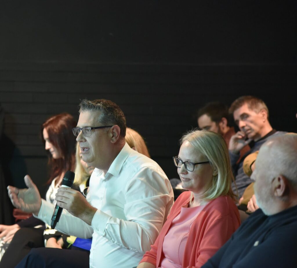 Prodorni podjetnik Jernej Čopi, ustanovitelj ENSOL 360, je s prisotnimi v gledališču delil, kako je svojo osebno ustvarjalnost in zanimanje za znanost vtkal v inovativni posel. Uspelo mu je, da je iz malega podjetja, iz t.i. domačega »laboratorija«, razvil uspešen mednarodni posel. O okolju, v katerem uspešno deluje, pa je Čopi povedal: