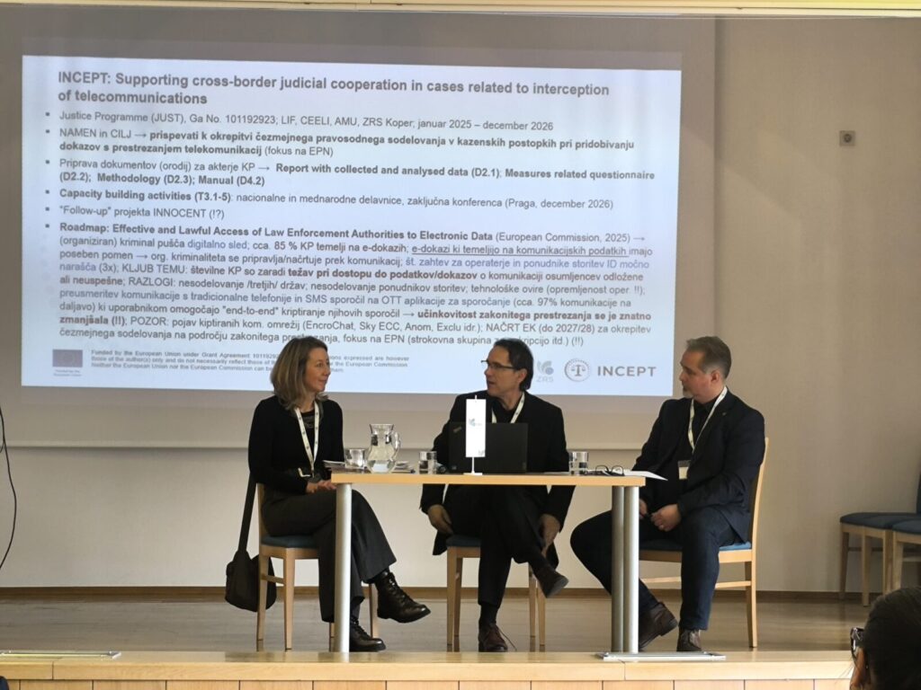 V četrtek, 6. februarja 2026, je na UL Fakulteti za pravo in ekonomijo Katoliškega inštituta v Ljubljani potekala prva nacionalna delavnica z naslovom Čezmejno pravosodno sodelovanje v primerih prestrezanja telekomunikacij v kazenskem postopku. ZRS Koper je delavnico organiziral v okviru projekta INCEPT (Supporting cross-border judicial cooperation in cases related to INterCEPTion of telecommunications), ki ga financira Evropska komisija v okviru programa JUST, izvaja pa ga konzorcij raziskovalnih organizacij iz štirih držav (poleg Slovenije sodelujejo Bolgarija, Poljska, in Češka). Namen projekta je prispevati h krepitvi čezmejnega pravosodnega sodelovanja v kazenskih postopkih, s poudarkom na izvajanju evropskega preiskovalnega naloga (EPN) v primerih prestrezanja telekomunikacij.